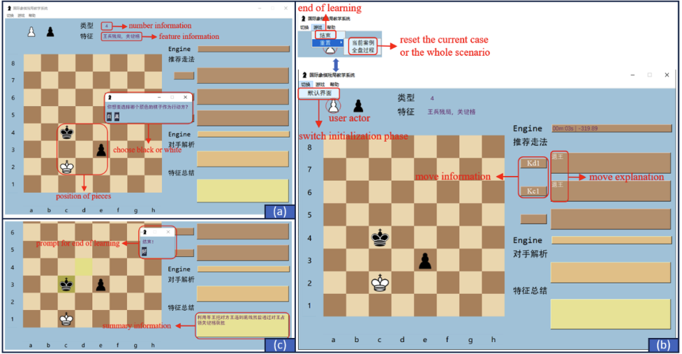 Figure. The user interface of the execution phase. (a) Information about the endgame scenario and prompts for users to choose either the black or white side; (b) The recommended moves, move explanation and user-executable buttons; (c) Learning completion prompts and learning summary information.